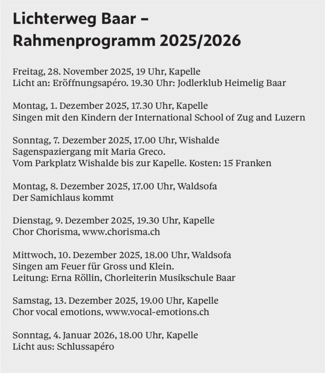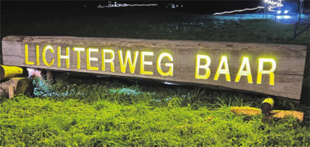 pd / In den letzten beiden Jahren präsentierte sich der Lichterweg Baar als Ypsilon: Vom Parkplatz beim Schützenhaus Wishalde konnte man entweder zur Kapelle oder zum Waldsofa spazieren. Der provisorische Weg, der den Lichterweg zum Rundweg machte, durfte nicht erstellt werden. Nun ist dies dank verschiedener Anpassungen wieder möglich. Der Lichterweg bietet nun wieder ein besonderes Erlebnis und eine stimmungsvolle weihnächtliche Runde am Fuss der Baarburg. Eröffnet wird der Weg am Freitag, 28. November. Die Lichter gehen nach Einbruch der Dämmerung an. Um 19 Uhr lädt der Verein Lichterweg zum Eröffnungsapéro bei der Kapelle Heiligkreuz. Um 19.30 Uhr begleitet der Jodlerklub Heimelig Baar die Eröffnung musikalisch. Bis am 4. Januar 2026 ist der Lichterweg täglich vom Einbruch der Dämmerung bis 22 Uhr in Betrieb. Am Freitag und Samstag brennen die Lichter bis 23 Uhr, an Heiligabend (24. Dezember) und Silvester (31. Dezember) wird der Lichterweg bis 00.30 Uhr leuchten. An verschiedenen Abenden finden kleine, aber feine Anlässe statt (siehe Box).