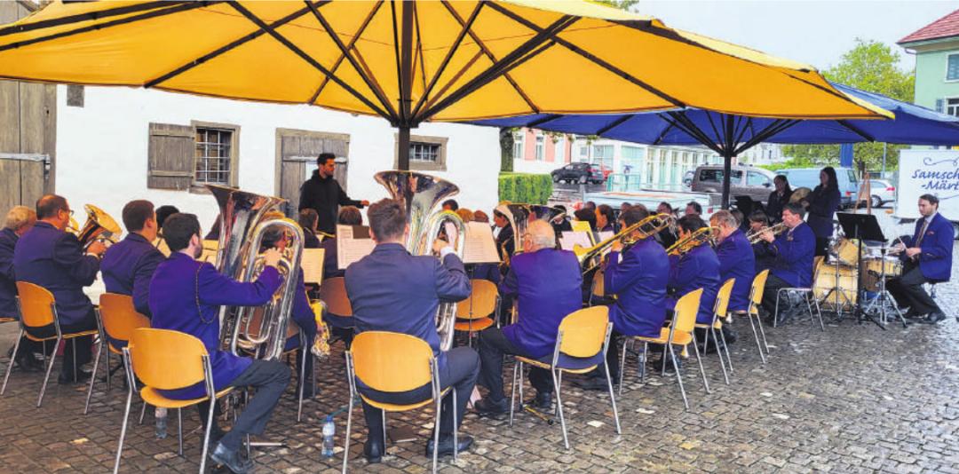 Kurz nach neun Uhr trafen die ersten Musikerinnen und Musiker ein und platzierten die Stühle unter zwei riesengrossen Sonnenschirmen. Das bot einen perfekten Auftrittsplatz und schützte auch die Notenständer und Instrumente vor der Nässe. Um halb zehn war die Feldmusik Baar unter der Leitung von Yannick Trares spielbereit und eröffnete das Ständli mit der «Marschparade».