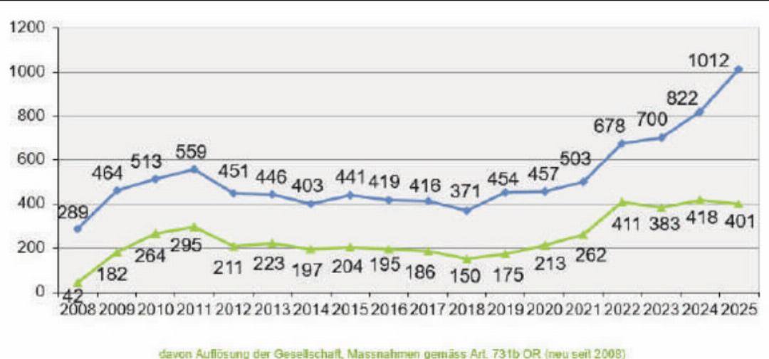 Die Konkurse aufgrund eines Organisationsmangels nahmen leicht ab (401 gegenüber Vorjahr 418). Ein solcher liegt vor, wenn die Organisation einer Gesellschaft hinsichtlich ihrer Verwaltung, Vertretung oder Revision nicht den gesetzlichen Bestimmungen entspricht und dies zur konkursamtlichen Liquidation führt, falls der Mangel nicht rechtzeitig behoben wird. Ebenso gilt ein fehlendes oder nicht korrektes Rechtsdomizil als Organisationsmangel. Die Zahl der ausgeschlagenen Erbschaften reduzierte sich von 60 im Vorjahr auf 56 im Jahr 2025.