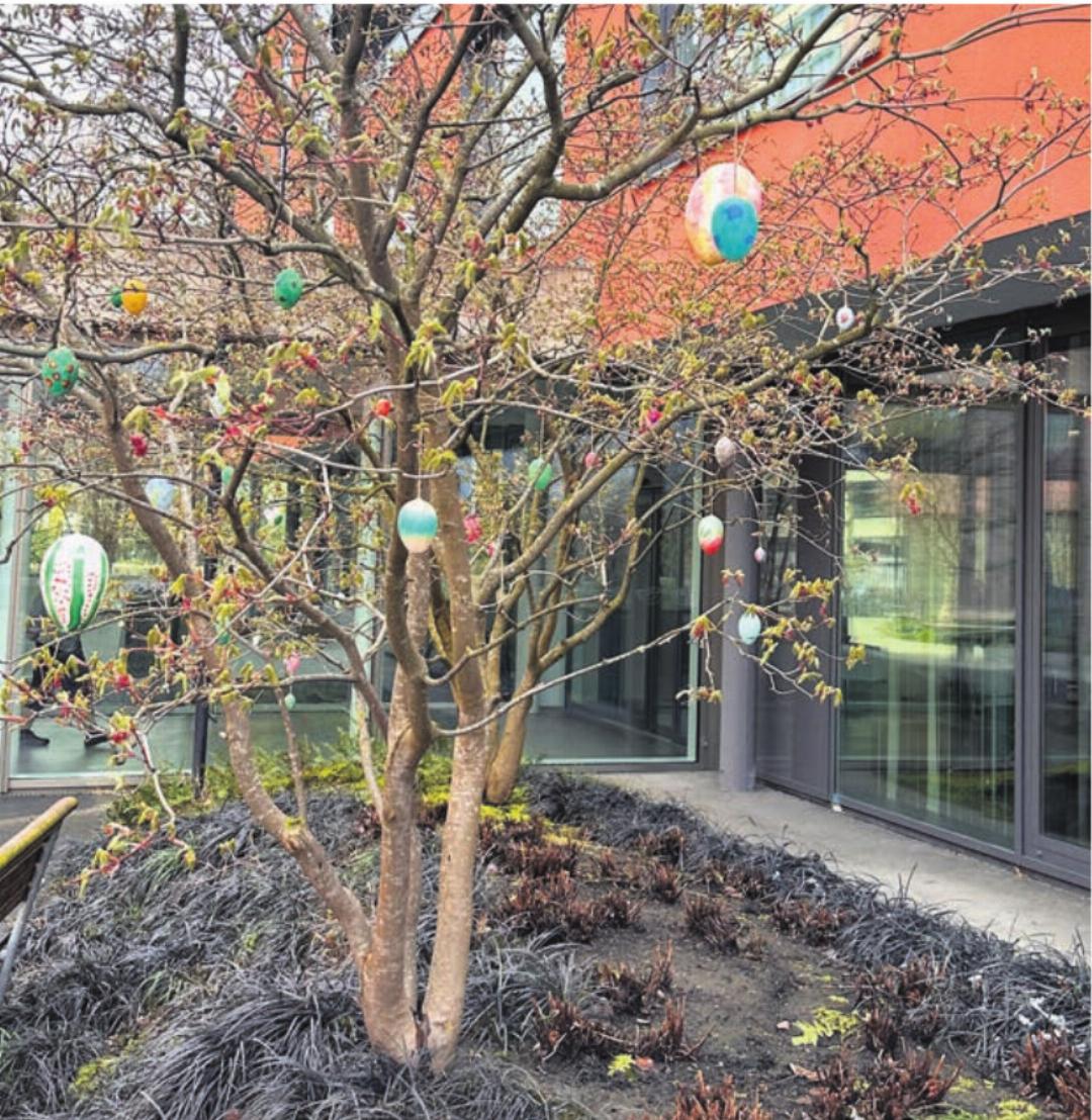 08.04.2026 Seniorenpd / Mit viel Kreativität, Freude und Engagement haben die Bewohnerinnen und Bewohner sowie Tagesheimgäste im Pflegezentrum Baar die Osterzeit auf besondere Weise eingeläutet. In den verschiedenen Aktivierungen wurden gemeinsam sowohl echte Ostereier als auch Kunststoff-Ostereier liebevoll bemalt. Die bunten, wetterfesten Kunstwerke schmücken nun die noch kahlen Bäume zwischen den Gebäuden des Pflegezentrums.