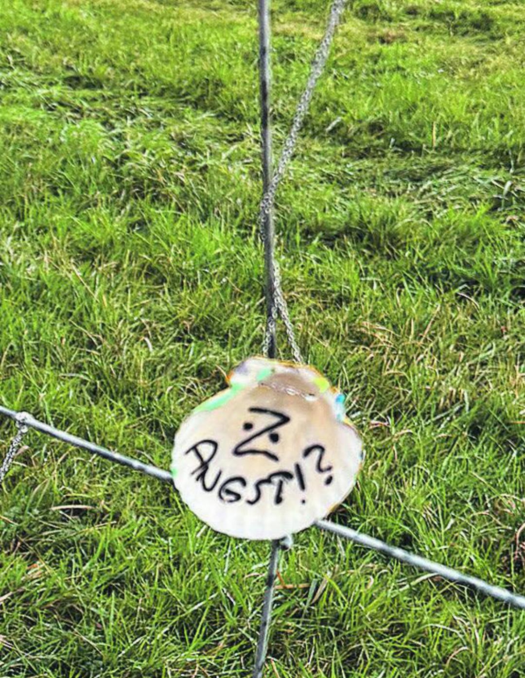 Da sich auf den Facebook-Aufruf niemand meldete, brachte Stadlin am Zaun einen Zettel mit demselben Aufruf an. Und siehe da, kurz darauf meldete sich eine Frau, die die Muschelinstallation umgesetzt hatte, gemeinsam mit ihrem Partner.