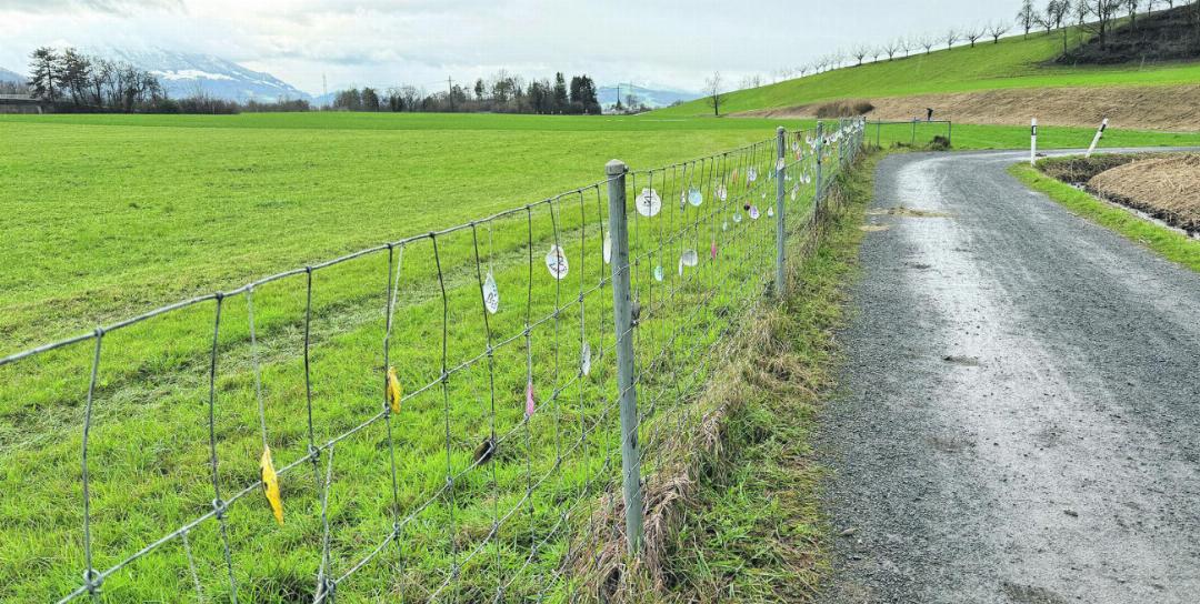 Dem Zauneigentümer Günther Stadlin fielen die Muscheln vor zwei Wochen auf. «Dutzende kleine, bemalte Stücke hingen am gut zwanzig Meter langen Zaun. Auf der einen Seite haben die Muscheln ein Sujet, auf der anderen Seite sind Wörter geschrieben.» Stadlin wollte wissen, wer diese Muscheln angebracht hatte, schliesslich geht es um die Sicherheit seiner Tiere, aber auch um Anstand und Respekt. Er startete einen Aufruf in den Sozialen Medien. Die Aktion führte keinen Anruf des Verursachers herbei, löste aber rasch Reaktionen aus. Einige fanden die Idee sympathisch, für andere ist es ein «No-Go», ungefragt fremdes Eigentum zu «verschönern».