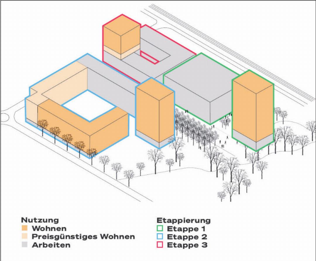In der zweiten Etappe (Baubereiche 1A und 1B, blau) sollen 100 preisgünstige Wohnungen und rund 200 weitere Miet- und Eigentumswohnungen in unterschiedlichen Grössen und Preissegmenten entstehen, zusätzlich Flächen für Büro und Gewerbe. Am Abstimmungssonntag vom 8. März wird den Stimmbürgern der Bebauungsplan für die Bereiche 1A und 1B zur Abstimmung vorgelegt. «Ziel des Bebauungsplans ist es, die Arealentwicklung fortzusetzen und ein modernes und lebendiges Quartier zu schaffen, das dringend benötigten Wohnraum sowie attraktive, öffentlich zugängliche Freiräume bietet», erklärt Gemeinderat Zari Dzaferi. «Der Gemeinderat empfiehlt deshalb, dem Projekt zuzustimmen und die Entwicklung des Gebiets Unterfeld Süd voranzutreiben.»